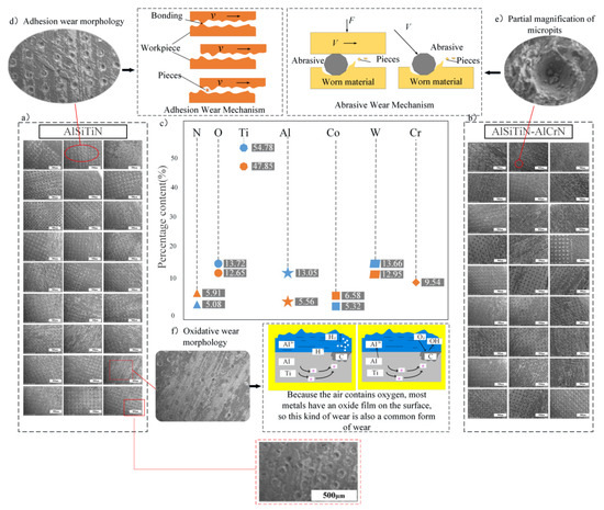 Wear morphology and the elemental content. (a) Wear morphology of AlSiTiN coating. (b) Wear morphology of AlSiTiN-AlCrN coating. (The scale of the images in (a,b) is 500 μm). (c) The mean value of the elemental composition of the AlSiTiN coating scanned on the surface area of the AlSiTiN–AlCrN coating. (d) Adhesion wear morphology. (e) Micro-pit local amplification map. (f) Friction principle diagram.