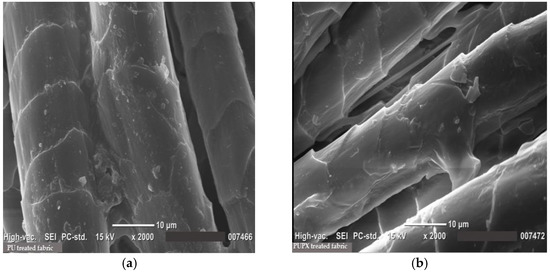 SEM images in Figure 6b reveal a uniform and smoother coating on the fiber surface and inter-fiber bonding when the PUPX coating is used, in comparison with the fabric coated with PU (Figure 6a).