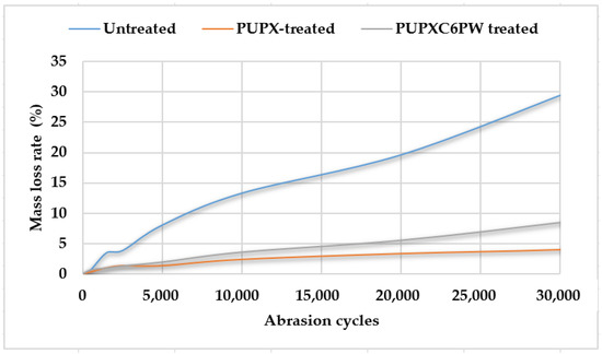 First, the untreated fabric was subjected to abrasion cycles in order to determine the cut-off point, which is the number of rubs required until the two-yarn breakage. Then, the treated samples were exposed to the same number of rubs corresponding to the cut-off point of the untreated fabric. The evaluation of the abrasion resistance of all fabric samples was determined using the mass loss rate, according to Equation (2):