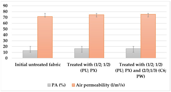 The samples treated with the final combination were tested to evaluate the impact of the treatments on the initial air permeability and thermal behavior of the worsted wool fabric used for this study. The results of the adiathermic power PA (%) and the air permeability (L/m2/s), of the initial untreated fabric, the sample treated with (1/2; 1/2) (PU; PX), and the sample treated with the final optimized combination (1/2; 1/2) (PU; PX) and (2/3; 1/3) (C6; PW) are presented in Figure 14.