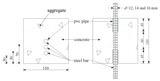 Twenty pull-out specimens were prepared for the test. The specimens were designed as a steel rebar embedded inside a 150 mm × 150 mm × 150 mm concrete cube. The steel rebars were 360 mm long with an equal embedment length in the concrete for all the specimens. The embedment length was 60 mm, which was achieved using two pieces of PVC tubing installed adjacent to the embedment region to avoid the contact between the concrete and the bar, as shown in Figure 1.
