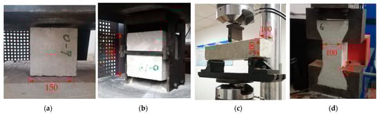 Details of mechanical property tests: (a) compressive strength; (b) splitting tensile strength; (c) flexural strength; (d) direct tensile strength.
