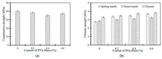 The effect of PVA fibers on the mechanical properties of concrete: (a) compressive strength; (b) splitting tensile strength, direct tensile strength, and flexural strength.