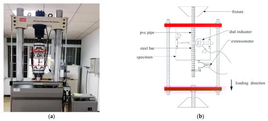 The pull-out test was carried out by using an MTS machine with a maximum axial force capacity of 100 kN. A special loading frame was designed for the present test, as shown in Figure 5. The loading end of the specimens and the loading frame were fixed by the upper and lower clamps of the MTS, respectively. The position of the upper plate of the loading frame can be adjusted to contact the specimen surface, which was used to minimize the effect of uneven stress and to prevent unexpected lateral movement of the specimens during the loading process. The pull-out force was automatically measured by the test machine. The relative slip between the steel bar and concrete was measured by an extensometer clamped at the free end of the specimens. Additionally, a dial indicator was set transversely on the specimen surface to measure the development of the crack during the loading test.