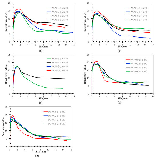 Bond stress–slip curves for the specimens. (a) d12-c70 series (c/d = 5.75); (b) d14-c70 series (c/d = 4.86); (c) d16-c70 series (c/d = 4.19); (d) d12-c50 series (c/d = 4.17); (e) d12-c30 series (c/d = 2.50).