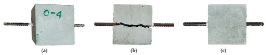 Three different failure modes were observed in the present test: pull-out failure, splitting failure, and splitting–pull-out failure. For the first failure mode, the specimens failed gradually as the steel rebar was pulled out without concrete cracking. In this case, the bond stress–slip curves contained typical three-branch characteristics including ascending, descending, and residual branches. For the second failure mode, the specimens failed suddenly as the splitting of the concrete was accompanied by a loud crash. Afterwards, the concrete members were completely broken apart. The bond stress–slip curves of the contents only contained the ascending branch. For the third mode, the specimens maintained integrity and the bond stress was not completely lost after the splitting of the concrete. In this case, the bond stress–slip curve contained the typical three-branch characteristics and showed a quasilinear degeneration in the descending branch. The final failure of these three modes are shown in Figure 7.