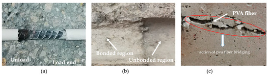 After the pull-out test, the specimens were split apart to visually inspect the damage of the rebar and concrete. The split parts were similar for all the specimens. Typical split parts are shown in Figure 8, which come from splitting failure specimen PVA0.2-d16-c70. The concrete between the ribs of steel rebar was smashed while no damage was found on the rebars for specimens that failed by pull-out and splitting. This indicates that the failure of all the specimens is started by the trapping of concrete particles between the rebar ribs. For the pull-out case, the concrete within the ribs would be totally polished by the rebars. For the splitting case, the further slip would cause the splitting of the concrete cover, which is restricted by PVA fibers. In the present test, PVA fibers were found to be pulled out rather than pulled off (see details in Figure 8c). In addition, it can be seen from Figure 8c that the obvious PVA fiber bridging effect limited the development of cracks, thus improving the performance of the concrete.