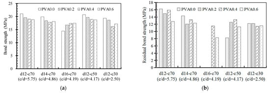 Figure 6 shows the bond stress–slip curves for specimens with different contents of PVA fibers. As mentioned before, the curves are significantly affected by the failure modes, i.e., the ratio of cover depth to rebar diameter. Moreover, the addition of PVA fibers also showed a significant effect on the bond stress–slip curves. The slope of the ascending branch and the bond strength decreased with the increase in PVA fibers. The slope of the ascending branch reflects the bond stiffness of the sample, which is mainly determined by the shear action between the concrete and the rib. According to Section 2.2, the addition of polyvinyl alcohol fiber would lead to a decrease of the flow performance of newly mixed concrete, which would affect the compactness of concrete, thus reducing the shear effect between the concrete and reinforcement, and ultimately leading to the decline of the bond strength between the concrete and reinforcement. The same phenomenon has been reported by many other researchers [,]. The details of the bond strengths of the specimens are shown in Figure 9a. All the specimens showed a descending trend in bond strength with the increase in PVA fibers except the d16-c70 series specimens. In this experiment, the maximum bond strength decrease of the d12-c30 series samples, d12-c50 series samples, and d12-c70 series samples with the increase in PVA fiber content was about 16.2%, 9.6%, 10.3%, and 10.4%, respectively. In the d16-c70 series, the additional of PVA fibers changed the failure of the specimens from the splitting mode to splitting–pull-out mode, which increased correspondingly the bond strength with a maximum increase of about 21.3%. In general, the addition of PVA fibers showed a negative effect on bond stiffness and bond strength between the rebar and concrete for both pull-out and splitting cases. The details of the residual bond strength of the samples are shown in Figure 9b. Similarly, except for the d12-c50 series of samples, the residual bond strength of all samples decreased with the increase in PVA fibers, and the maximum decrease was about 27.9%. This indicates that the content of PVA fibers has a more adverse effect on the residual binding strength of samples. It can be clearly seen from Figure 6 that for the PVA0.0-d16-c70 and PVA0.2-d16-c70 samples, due to the lack of effective restraint in the concrete, splitting failure occurred immediately after reaching the peak load, and then the load rapidly dropped to 0. Therefore, the bond stress–slip curve did not decline and the residual bond strength was 0.