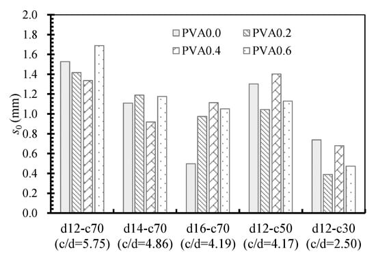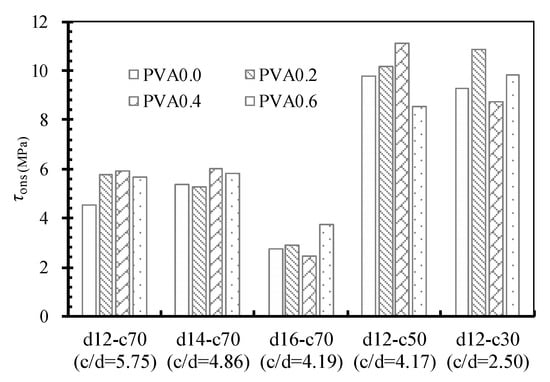 The slip corresponding to maximum bond stress and the bond stress at the onset of free end slip for specimens with different contents of PVA fibers are shown in Figure 10 and Figure 11, respectively. It can be found that the PVA fibers had negligible effects on the corresponding slip to maximum bond stress and the bond stress at the onset of slip. For each series of specimens with the same cover depth and rebar diameter, the changes in the slip and the onset bond stress did not correspond with the increase in PVA fibers. The slip corresponding to maximum bond stress, however, was more significantly affected by the ratio of cover depth to rebar diameter, i.e., the failure mode of specimens. The specimens that failed by pull-out mode usually had a large corresponding slip. The smaller the ratio of cover depth to rebar diameter, the smaller the corresponding slip. The bond stress at the onset of slip seemed to be further affected by the diameter of the rebars. The pull-out failure specimens had similar onset bond stresses. The splitting failure specimens had high onset bond stresses for cases with small rebar diameters. The details are discussed in the following sections.