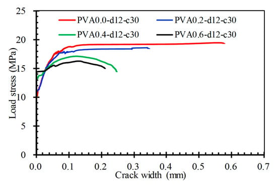 Figure 12 shows the propagation of splitting cracks for the d12-c30 series specimens. For the plain specimens, the splitting crack appeared at low load stress and gradually propagated with the increase in applied load stress. There was a sudden widening in cracking and the width rapidly increased to a greater value after the peak load stress. Afterwards, the splitting crack was almost unchanged during the further load procedure. The propagation of splitting cracks in the specimens with 0.2% PVA fibers was similar to that of the plain specimen, but with a narrow crack at the end. For specimens with 0.4% and 0.6% PVA fibers, the load stresses corresponding to the appearance of splitting cracks significantly increased. Additionally, there was no sudden widening of the cracks after the peak load stress. The final crack width became much narrower compared to that on the plain specimen. PVA fibers play a positive effect in restricting the splitting cracks.