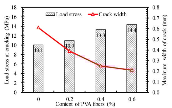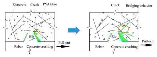 The details about the comparison of cracking load stress and maximum crack width for specimens with different contents of PVA fibers are shown in Figure 13. Specimens with 0.2%, 0.4%, and 0.6% PVA fibers had increased cracking load stress by about 8.37%, 31.44%, and 42.43% and decreased the final crack width by about 36.23%, 59.02%, and 65.08%, respectively. The changes in the final crack width were more obvious. This indicates that the PVA fibers restrict both the micro-cracking and macro-cracking of specimens that failed by splitting. The restriction effect on macro-cracking seemed much more significant than that on micro-cracking. In the process of steel bar pull out, with the increase in stress, the PVA fibers effectively bridged the cracks generated by the steel bars in the process of concrete pull out, and the bridge effect diagram is shown in Figure 14.