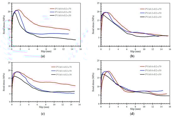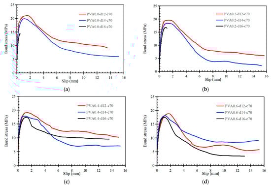Bond stress–slip curves for the specimens with different rebar diameters. (a) PVA0.0-c70 series; (b) PVA0.2-c70 series; (c) PVA0.4-c70 series; (d) PVA0.6-c70 series.