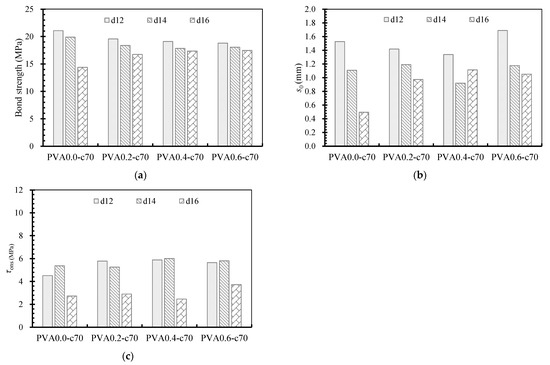 The details about the comparison of bond strength, slip corresponding to bond strength, and the bond stress at the onset of free end slip for specimens with different rebars are summarized in Figure 16. Almost all of the bond strength, slip corresponding to bond strength, and the bond stress at the onset of free end slip decreased with the increase in rebar diameter. For example, the increase of rebar diameter from 12 mm to 14 mm and 16 mm in the PVA0.2-c70 series specimens decreased the bond strength by about 6.1% and 14.4%, decreased the corresponding slip by about 16.0% and 31.3%, decrease the bond stress at the onset of free end slip by about 9.1% and 49.9%, respectively. The larger the diameter of the steel rebar, the smaller the bond strength, the corresponding slip, and the bond stress at the onset of free end slip. These results are consistent with previous studies [,,]. This could be attributed firstly to the more uneven distribution of bond stress along the rebars with large diameters than that of rebars with small diameters. Secondly, rebars with a large diameter tend to more easily trap bleeding water, resulting in more voids around the rebars, reducing the concrete and rib shear between the steel bars, thus reducing the interaction between the steel and concrete. Finally, the shear effect between the reinforced concrete and rib is the main part of the bonding force of reinforcement. According to the measured steel contour data, with the increase in the diameter of the reinforcement, the relative spacing of the reinforcement ribs decreases, and the relative height of transverse ribs decreases, leading to the reduction of the shear effect between the reinforcement and concrete, thus reducing the bonding force between the reinforcement and concrete.