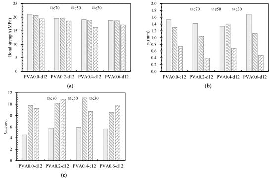 The details about the comparison of bond strength, slip corresponding to bond strength, and the bond stress at the onset of free end slip for specimens with different cover depths are summarized in Figure 18. The bond strength and the corresponding slip of specimens decreased with the decrease in cover depth, while the bond stress at the onset of free end slip increase significantly with the decrease in cover depth. For instance, the decrease in cover depth from 70 mm to 50 mm and 30 mm in the PVA0.6-d12 series specimens decreased the bond strength by about 0.6% and 8.7%, decreased the corresponding slip about 33.1% and 72.0%, but increased the bond stress at the onset of free end slip by about 51.5% and 74.0%, respectively. The reason for the positive effect of a thin cover of the bond stress at the onset of free end slip could be similar to that for the initial bond stiffness, as discussed previously.