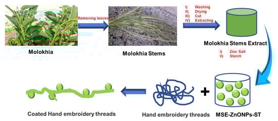 Due to their critical importance in the economies of various nations in terms of rising income, innovation, and technological advancement, craft industries have drawn the attention of numerous nations and researchers. They also play a role in fostering social progress and creating job opportunities. Interestingly, the features of the textiles and threads used, such as their breaking strength, antibacterial properties, and UV protection from harmful rays, have had an impact on the handcraft industries in numerous countries [,,,,,]. Hand embroidery is one of the best-known crafts; however, the quantity of threads used determines how much of the design is used in ambiguous areas. It is made of repeating geometric patterns, and the distance between stitches produces dark, medium, and light areas within the design. As a result, embroidery has gained popularity in a variety of applications, including bolstering collars, strengthening sleeves, and concealing dirt [,]. Chemical treatment of the threads utilized in hand embroidery could change their color and alter their unique properties [,,,,,,]. Therefore, stretching and imparting new functions to threads without fluctuating their colors using a green and facile approach will be required. In our previous studies, innovative green treatments were conducted for textile fabrics to be protected against fire hazard, harmful UV rays, and bacterial growth [,,]. Additionally, molokhia (Corchorus olitorius L.), a well-known Egyptian vegetable, also known as Egyptian spinach, is grown in large quantities every year. Unexpectedly, it was discovered that molokhia extract has a wealth of beneficial phenolic and antioxidant chemicals, such as such as vitamin C, vitamin E, β-carotene, α-tocopherol, glutathione, and phenols [,,], that have the potential to function as reducing agents to metal ions []. This is in addition to the existence of terpenoids, which serve as capping agents for synthesized metal nanoparticles [,]. Hence, in this study, different colors of hand embroidery threads were facilely treated using a green method involving green nanocoatings. In this approach, ZnO nanoparticles (ZnONPs) were prepared using an extract of molokhia stems at ambient conditions, followed by wrapping with starch and coating on hand embroidery threads. The tensile strength and antibacterial properties of coated threads were studied. Moreover, the surface morphology of the untreated and treated threads was investigated, which were utilized in embroidery.