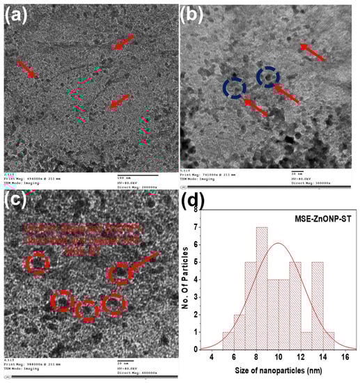 TEM image of (a) MSE-ZnONP-ST and (b,c) corresponding high-magnification images. (d) Histogram of ZnONP dispersion in MSE-ZnONP-ST (the dispersion of ZnONPs is depicted by red arrows and circles).