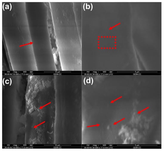 SEM image of (a) untreated cotton hand embroidery threads of sample 1 and (b) the corresponding high-magnification image, and (c) treated cotton hand embroidery threads of sample 1-T and (d) the corresponding high-magnification image displaying the rough surface.