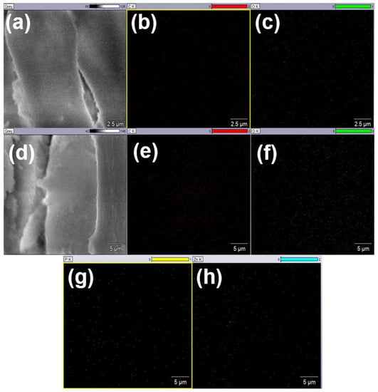 (a) SEM image and (b,c; displaying mapping of C and O) EDS mapping of untreated cotton hand embroidery threads. (d) SEM image and (e–h; displaying mapping of C, O, P and Zn) EDS mapping of treated cotton hand embroidery threads, displaying a good dispersion of ZnONPs.