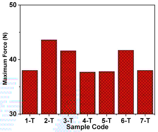 Colum bar graph presenting the tensile strength performance of different coated samples presented from 1 to 7-T as T refers to treated threads.