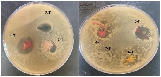 Digital photos of the clear antibacterial inhibition zone for different coated cotton hand embroidery threads presented from 1 to 7-T as T refers to treated threads.