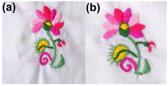 Interestingly, the developed nanocoating endows the cotton hand embroidery threads with new features, such as good reinforcement and antibacterial properties without varying their unique color and flexibility feature. This is obvious from the digital photos of textile fabrics processed on their surface using cotton hand embroidery threads before and after coating on textile fabrics, displaying no change in color or flexibility, as shown in Figure 7.