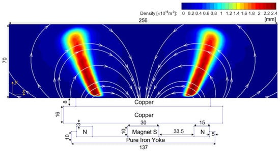 Magnetic yokes commonly consist of ferromagnetic materials with high permeability and focus magnetic fluxes in the desired direction or position. In a DCMS system, magnetic yokes make magnetic fluxes from permanent magnets concentrate in the direction toward plasmas. The concentrated magnetic fluxes enhance the magnetic fields and the density of plasmas. The effects of various yoke configurations, including a wide yoke that moves the region of target erosion, were previously reported []. It shows that it is possible to control plasmas and target erosion profiles using the yoke magnets. In this section, the effects of the yoke thickness are discussed. The magnetic field lines and the magnitude of the magnetic flux density, with a thickness of the magnetic yoke of 15 cm, are depicted in Figure 5. The thicker yoke pulls the magnetic field slightly more toward the target, enhancing the magnetic field near the target.