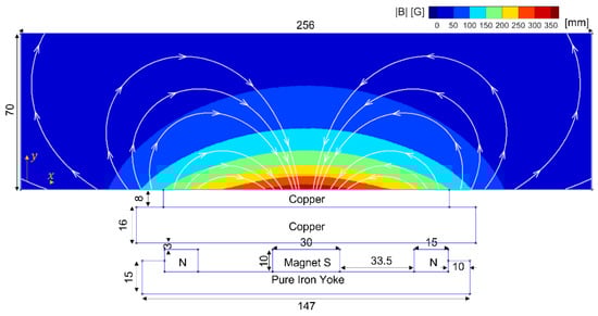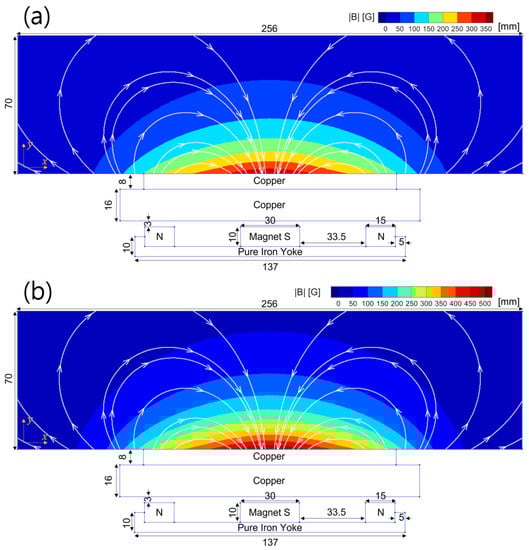 At first, two cases were selected to investigate the role of the magnitude of the magnetic flux density. Here, the configuration of the permanent magnets is the same, but only the magnitude is different. The profiles of magnetic fields are depicted in Figure 2, where the maximum intensity of magnetic fields is in Figure 2a and in Figure 2b. They have the same magnetic field profiles, but the color bar scales and maxima differ for both figures. The height of the yoke is 10 mm, and the widths of the magnets are 30 mm for the south pole and 15 mm for the north pole. The gap distance from the north pole to the south pole is 33.5 mm and symmetric.
