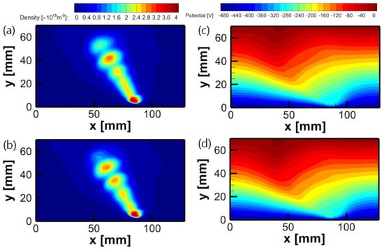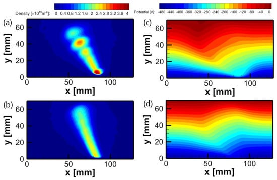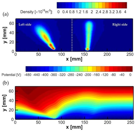 (a) Plasma density and (b) electric potential of the asymmetric magnetic flux density shown in Figure 8.