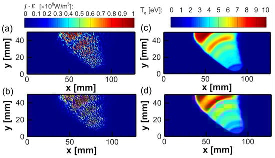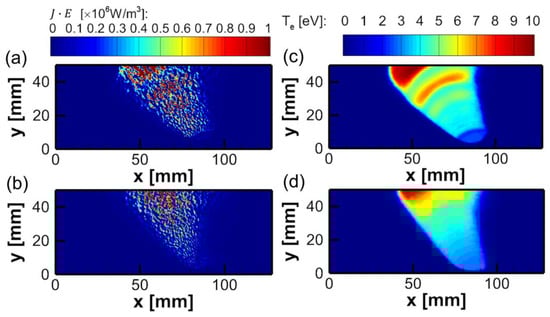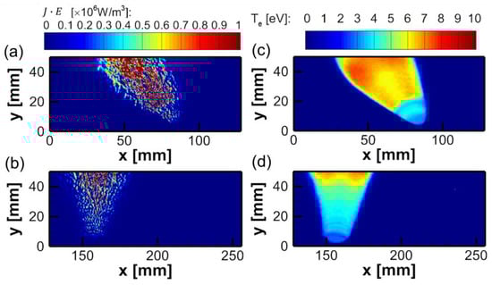 Figure 4 shows the Ohmic electron heating, , and the electron temperature , where is the electron current density, and is the electric field intensity. Figure 4a shows enhanced electron heating in a broader space for the 350 G case compared with Figure 4b for the 500 G case. The electron temperature is higher near the substrate than the target, as shown in Figure 4c,d. Most ionizations occur in the high electron temperature region near the substrate. The source of the energetic electrons is the ion-induced secondary electron emission (SEE) from the target. They are accelerated by the electric field inside the sheath in front of the target to ionize the neutral gas or pass through the magnetized region until they meet the sheath in front of the substrate. These electrons make the high-temperature region near the substrate. The ions generated there are accelerated directly toward the target to induce SEE without collisions at very low pressure. That is why the plasma density of the 500 G case is lower even though it has stronger magnetic fields and higher electron temperatures near the target than that of the 350 G case. It indicates that more ionization near the substrate is the key to enhancing the DCMS discharge at very low pressure. Another noticeable difference is that heated electrons in the 350 G case are the primary reason for the striation. The fundamentals of this phenomenon are not fully analyzed here, but an additional electron heating mechanism exists in addition to the γ-mode in typical DC or DCMS plasmas, unlike the 500 G case. The striation of DCMS plasmas is barely found at pressures higher than a few mTorr, as shown in the previous study with a similar magnetic condition []. The striation phenomenon may have a sudden transition regime depending on the magnetic field intensity, which will be investigated more in future work.
