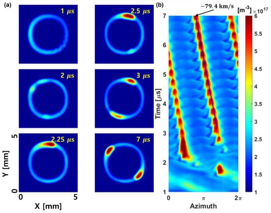 Figure 12a presents the change in the simulated density of DCMS plasmas under the symmetric magnetic field shown in Figure 11a. Initially, the plasma density profile shows azimuthal symmetry at 0.75 ms. However, after 1 ms, it shows the evolution of the m = 1 mode. Finally, after 2.5 ms, the plasma density shows an m = 2 mode. Figure 12b shows the time evolution of the plasma density in the azimuthal region at the center, which clearly shows the growth of the m = 1 mode from 1 to 2 ms and the m = 2 mode after 2.5 ms. The symmetric magnets cause rotating structures of plasmas, which are well known as a phenomenon of rotating spoke instabilities [,,,,]. In this case, the dominant mode is in the steady state. The direction of rotation is clockwise, and the rotation velocity is . At the steady state, the m = 2 mode has an oscillation frequency of 3.03 MHz.