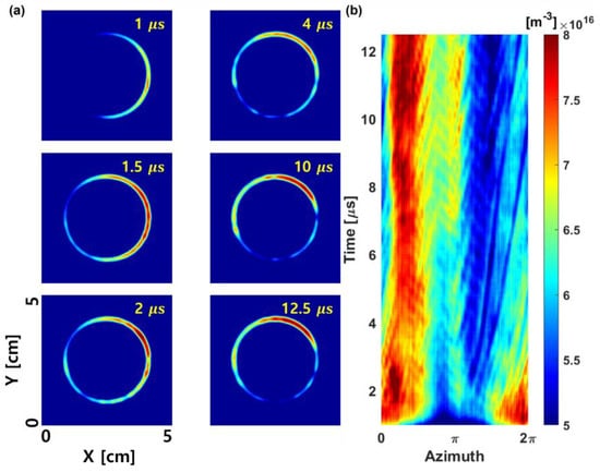 Time evolution of (a) spatial distributions of plasma density in xy plane with the asymmetric magnet and (b) azimuthal distributions of the plasma density.