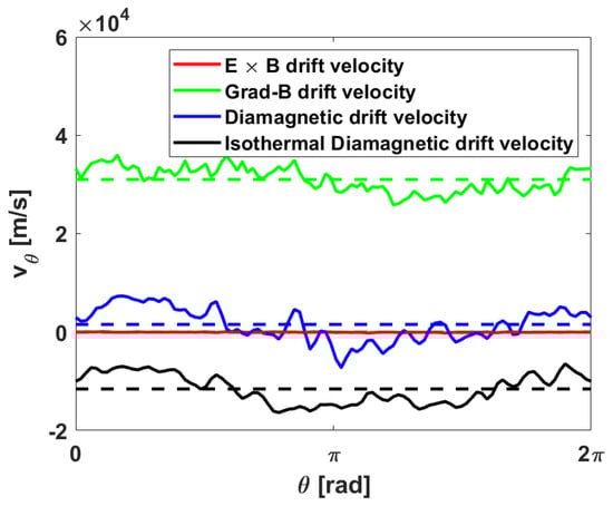 Azimuthal drift velocities were measured at z = 3.125 mm and r = 1.6 cm for E × B (red), grad-B (green), and diamagnetic (blue) drift, respectively. The black line is for the diamagnetic drift under the assumption of an isothermal plasma without a temperature gradient. Dashed lines indicate the mean values of each drift velocity.