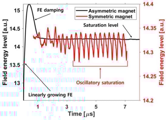 Saturation levels are shown in logarithmic scale for the normalized potential energy with an asymmetric (black) and a symmetric (red) magnet.