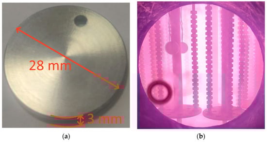 The coatings were deposited using an upgraded VIT-2 vacuum plasma unit [66,67,68,69,70], (IDTI RAS-MSTU STANKIN, Moscow, Russia). This unit uses a combination of filtered vacuum cathode deposition (FCVAD) [71,72,73,74,75,76] and controlled accelerated arc deposition (CAA-PVD) technologies [77,78]. Cathodes of Cr (99.9%), Mo (99.8%), Zr (99.8%), and Ti (99.6%) were used. The placement of the samples during the coating process is shown in Figure 1b. Before coating deposition, the samples were subjected to washing in a special solution with ultrasonic stimulation. During the deposition process, the samples were subjected to preliminary ion cleaning in order to thermally activate the surface and remove residual contaminants and oxide films.