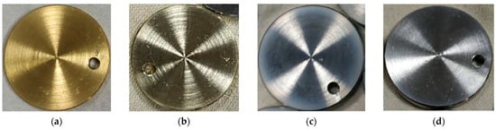 The investigations were carried out on Cr-CrN, Ti-TiN, Zr-ZrN, and Mo-MoN coatings deposited on Ti-6Al-4V titanium alloy plates (Figure 1a). Titanium plates were made on a lathe, and thus their surfaces (both end and side) were formed as a result of turning. Sample sizes are shown in Figure 1a.