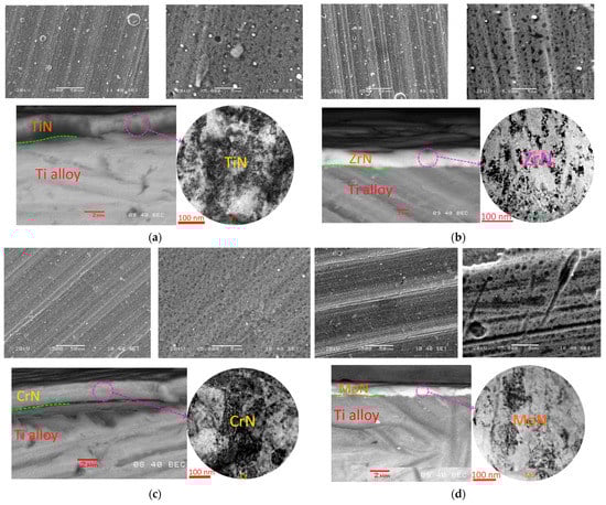 Surface morphology (top) and structural features (right—TEM, left—SEM) (bottom) of the samples with the (a) Ti-TiN, (b) Zr-ZrN, (c) Cr-CrN, (d) Mo-MoN coatings.