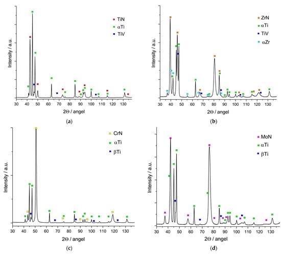 Phase analysis of the coated samples reveals the presence of a c-TiN, c-ZrN, c-CrN, or c-MoN phase, respectively (Figure 4). On the other hand, the ZrN-coated sample contains an insignificant amount of the α-Zr phase that may belong to trace amounts of Zr microparticles on the coating surface. The α-Ti and β-Ti phases of the substrate (titanium alloy) and the intermetallic compound (TiV) were also detected.