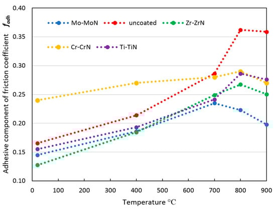 The analysis of the evolution of the adhesive component of the friction coefficient fadh as a function of temperature (Figure 5) shows that with an increase in temperature from 20 to 700 °C, the value of fadh increases for all samples. With the continuous increase in temperature above 700 °C, different trends appear in the samples with the different coatings. The Mo-MoN-coated sample shows a noticeable decrease in the fadh value with increasing temperature in the temperature range of 700 to 900 °C. At a temperature of 900 °C, the Mo-MoN-coated sample shows the lowest fadh value of all considered samples. Such a fadh behavior for this sample can be associated with the beginning of the formation of a tribologically active molybdenum oxide (MoO2) film [87]. For the other samples, an increase in the fadh value is detected up to a temperature of 800 °C, then a slight decrease in temperature is observed from 800 to 900 °C. This decrease can be associated with both the general plasticization of the material and the beginning of the formation of oxides of the respective metals that affect the tribological properties. At a room temperature of 20 °C, the minimum value of fadh is detected for the Zr-ZrN coated sample, and the maximum value for the Cr-CrN coated sample, which is in good agreement with the literature results [66,67,68,69,70,71,72,73,74,87,88,89]. In the temperature range of 20–400 °C, the sample with the Zr-ZrN coating has the best tribological properties, while at temperatures between 700 and 900 °C, the sample with the Mo-MoN coating provides the minimum fadh value. All the coatings considered, except for Cr-CrN, lead to a decrease in the fadh value over the whole temperature range compared to the uncoated sample, as has also been demonstrated for Zr-ZrC coatings [90,91,92].