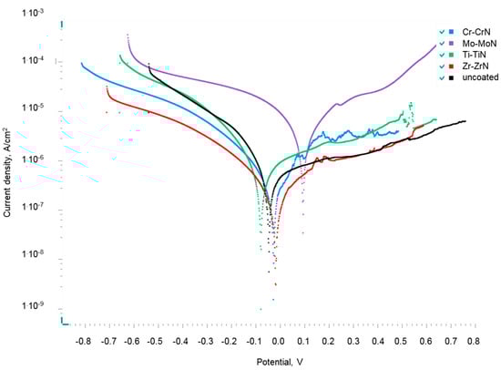 The potentiodynamic polarization curves (the potentiodynamic polarization measurements (PDP)) of the considered Cr-CrN, Ti-TiN, Zr-ZrN, and Mo-MoN coatings on the surface of the Ti-6Al-4V alloy and in the 3 wt.% NaCl solution are shown in Figure 6. The value of the equilibrium (near-equilibrium) potential of the corrosion process for the uncoated sample of the Ti-6Al-4V alloy is −0.045 V, which indicates the good corrosion resistance of this material in the 3 wt.% NaCl solution in the presence of oxygen and is in good agreement with the results reported in the literature [32,36]. The deposition of the Ti-TiN coating reduces the value of the steady-state corrosion potential to −0.078 V, which is in line with the known corrosion resistance data of Ti-6Al-4V titanium alloy and titanium nitride coating [36,37]. On the other hand, the deposition of Cr-CrN, Zr-ZrN, and Mo-MoN coatings leads to an increase in the equilibrium potential of the corrosion process to −0.026, −0.017, and +0.095 V, respectively, indicating the higher corrosion resistance of the CrN, ZrN, and MoN systems compared to the Ti-6Al-4V alloy and the TiN system.