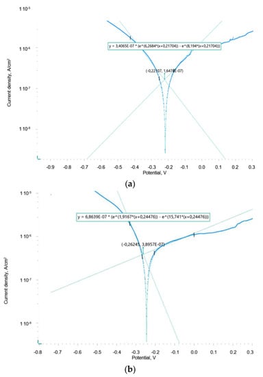 where and are the Tafel coefficients, with V and V/decade units, respectively, icorr is the corrosion current density (A/cm2), R is the universal gas constant, 8.314 J/(mol∙K), T is the absolute temperature, K, F is the Faraday constant, 96,485.33 C/mol, io is the exchange current density (A/cm2), and n is the number of electrons involved in the reaction.