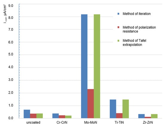 Comparative diagram of the corrosion current density values for the plates made of Ti-6Al-4V alloy and coated with Cr-CrN, Ti-TiN, Zr-ZrN, and Mo-MoN in the 3 wt.% solution of NaCl, calculated by mathematical modeling of the corrosion process by the methods of iteration, polarization resistance, and Tafel extrapolation.