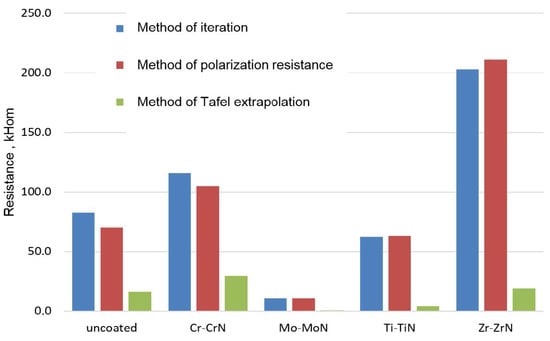 Comparative diagram of the polarization corrosion resistance values for the plates made of Ti-6Al-4V alloy and coated with Cr-CrN, Ti-TiN, Zr-ZrN, and Mo-MoN coatings in the 3 wt.% solution of NaCl, defined by mathematical modeling of the corrosion process by the iteration methods.