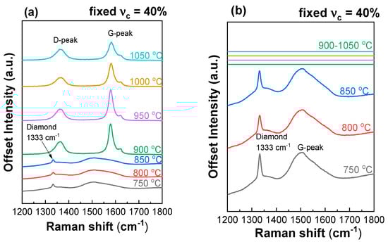 An increase in the substrate temperature or methane concentration leads to a decrease in the quality of the diamond. However, while, for 900 °C, this is an exponential trend, for 800 °C, it is almost linear. In addition, note an order of magnitude difference in the sp2/sp3 ratio between Figure 6a,b. Thus, at ultrahigh methane concentrations, temperature has more of a significance than methane concentration.