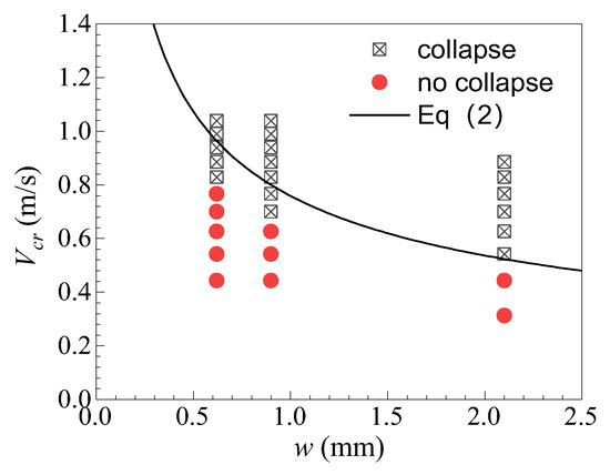 The critical velocity for the droplet collapsing on the superhydrophobic mesh changes as a function of the width of the mesh gap, as shown in Figure 7. Equation (2) agrees well with experimental results, which shows that an impacting droplet is easier to collapse and is divided by the mesh as the size of the mesh gap increases.