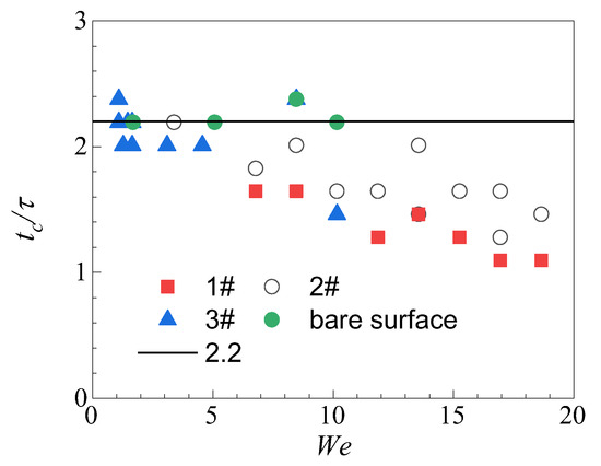 Figure 9 shows the contact time of a droplet on different substrates. As a droplet impacts a bare solid superhydrophobic surface, the contact time is independent of the impacting speed, i.e., [44]. However, the contact time of the droplet on the superhydrophobic mesh is not constant and decreases as the impacting speed increases on the superhydrophobic mesh. On No. 2 of the superhydrophobic mesh, the normalized contact time of the droplet is only 54% of the one on the bare superhydrophobic substrate at We = 17.