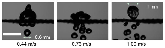 The impacting velocity affects the dividing process of the impacting droplet on the superhydrophobic mesh significantly. As shown in Figure 10, as the impacting speed increases, the number of divided tiny droplets that pass through the superhydrophobic mesh increases. For example, when the impacting speed is 0.44 m/s on 2# superhydrophobic mesh, where the width of the mesh gap is 0.9 mm, only one tiny droplet (with a diameter of ~ 0.6 mm and a volume of ~0.11 μL) passes through the mesh. However, over 10 tiny droplets are divided from the droplet and pass through the mesh as the impacting velocity increases to 1.00 m/s, and the volume of the rest of the droplet is much smaller than the original one. As shown in the last image of Figure 10, the diameter of the droplet that rebounds off the superhydrophobic mesh is ~1 mm, where and , which agrees well with the real contact time of the droplet.