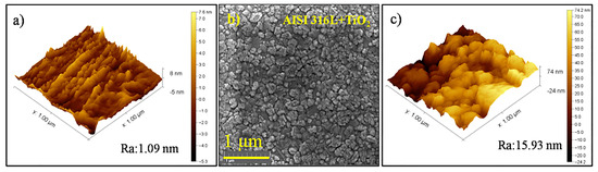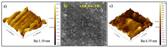 The AFM image of the AISI 304 sample (Figure 1a) indicated that the substrate surface had a roughness of 1.19 nm prior to the film deposition. The FEG-SEM image of the TiO2 thin film deposited on the AISI 304 (Figure 1b) showed that the film was composed of grains with irregular shapes and different sizes in the tenths of nanometers, resulting in a smooth surface. At an increased magnification (Figure 1c), the AFM image of the TiO2 film topography showed roughness without any curling from the substrate, in agreement with earlier work by the same research group [38]. It can be seen from Figure 1b that the film was smooth, with a roughness of 4.35 nm, and densely covered the substrate.