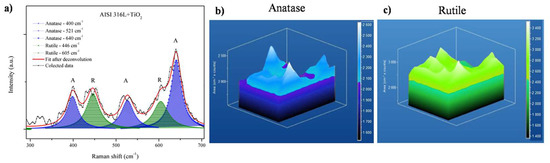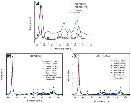 Figure 4b shows a zoom from 300 cm−1 to 700 cm−1. Comparing the lowest bands using the deconvolution process, it is possible to observe from the same spectra the anatase and rutile region for AISI 304. In addition, Figure 4c shows a zoom from 300 cm−1 to 700 cm−1 comparing the lowest bands using deconvolution processes for AISI 316L. The bands corresponded to a mixture of anatase and rutile phases. The anatase phase was reported by Evans and Sheel [8].