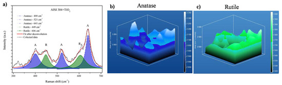 Raman mapping was used to investigate the distributions of the anatase and rutile phases in the deposited TiO2 film. Figure 5 shows the data obtained for the AISI 304 + TiO2 sample. Figure 5a shows an overlap of 20 Raman shift plots, where the main anatase and rutile bands are indicated, respectively. The color bar on the right side of the 3D images indicates the Raman intensity, corresponding to the relative concentrations of the anatase and rutile phases. Figure 5b shows the 3D Raman mapping of anatase (135 to 175 cm−1 in the Raman spectrum) in the AISI 304 + TiO2 film, while Figure 5c shows the mapping of rutile (595 to 635 cm−1 in the Raman spectrum). Raman mapping is a powerful instrument to show phase mixtures, as previously demonstrated in other research from our group, to detect terpene bands [42].