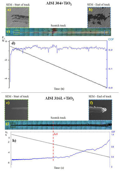 Scratch test results show the friction coefficient (COF) values for the TiO2 films deposited on the AISI 304 and AISI 316L substrates. The SEM micrographs show images of the AISI 304 + TiO2 sample at (a) the start and (b) the end of the track with a total length (c) of 10 mm and (d) Graph showing the normal force (black line) from 0 to −5 N and the COF (blue line) during the scratch test on the AISI 304 + TiO2 sample. of the AISI 316L + TiO2 sample at (e) the start and (f) the end of the track with total length (g) of 10 mm. (h) Graph showing the normal force (black line) from 0 to −5 N, the COF (blue line), and the critical load (Lc1, dashed red line) during the scratch test on the AISI 316L + TiO2 sample. The negative normal force values were due to the direction of the applied force. The total test time was 100 s.